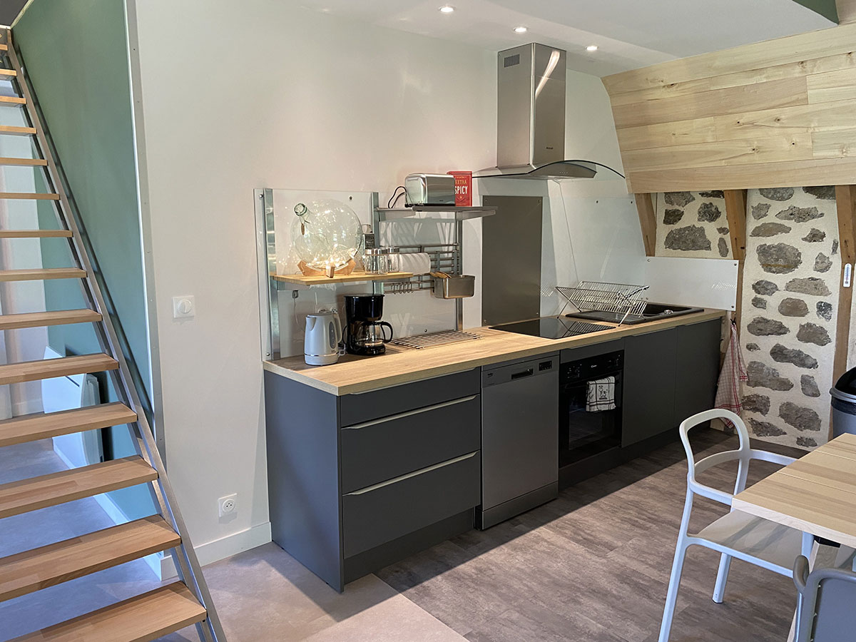 Cuisine ouverte entièrement équipée (lave-vaisselle, micro-ondes, compartiment congélateur dans frigo, cafetière traditionnelle, bouilloire, grille pain...).