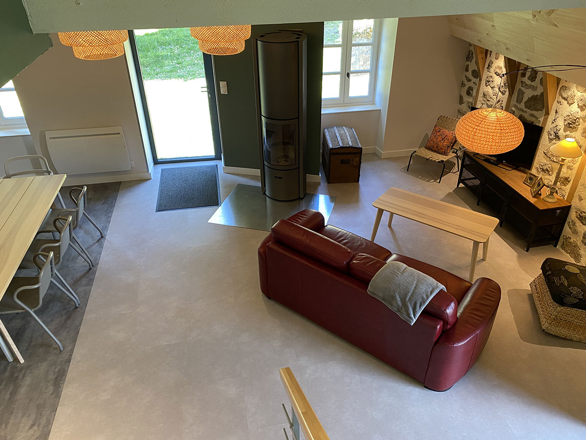 Grande pièce de vie avec poêle à bois, une salle à manger, un salon avec coin TV à écran plat, canapé.